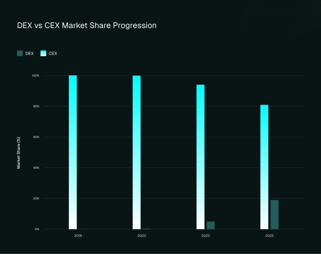 Pangsa pasar DEX diproyeksikan akan melampaui CEX dalam 2–3 tahun ke depan, didorong oleh kematangan struktural dan permintaan akan kustodi mandiri (self-custody).