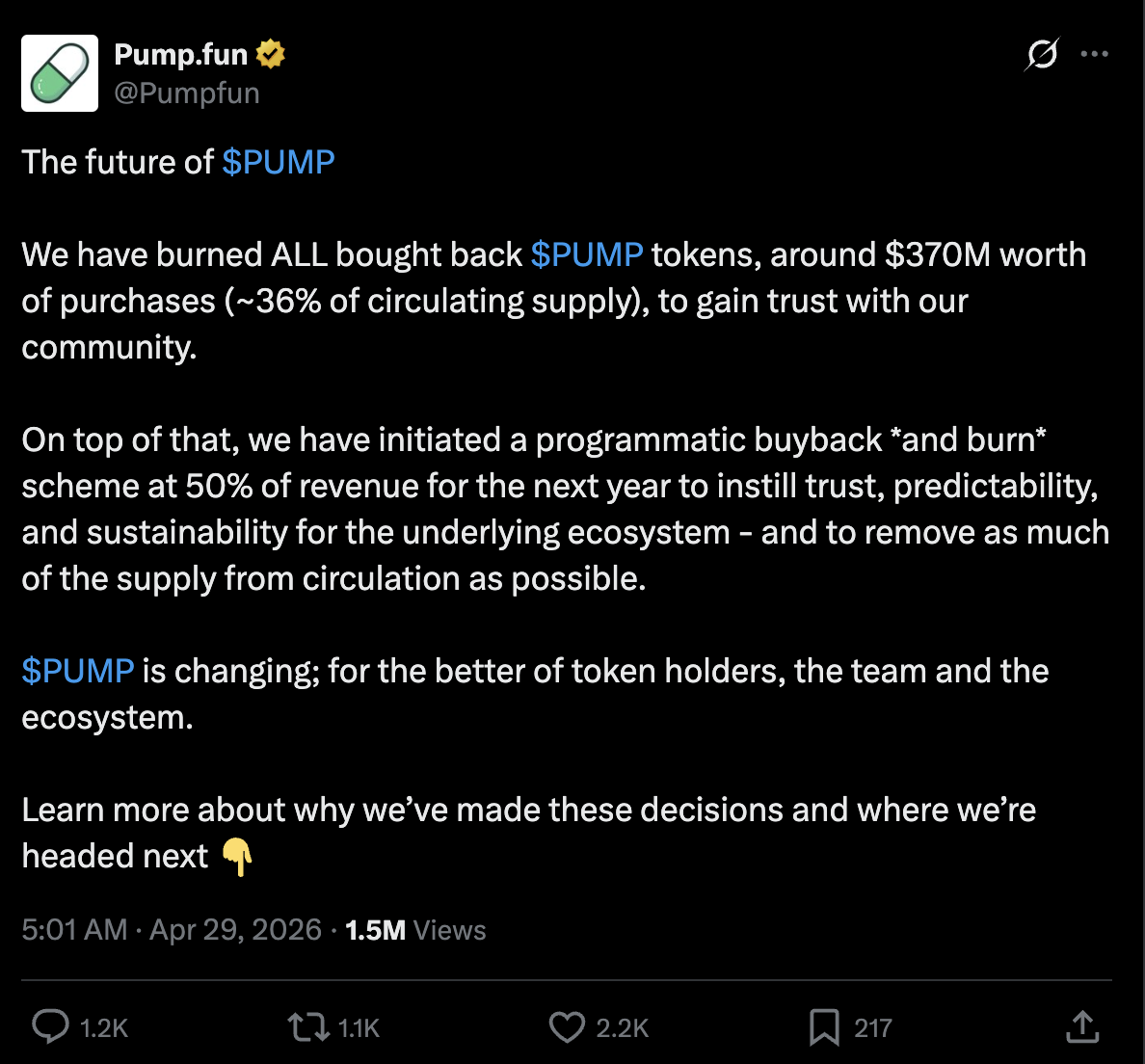 Selain pembakaran awal, Pump.fun juga meluncurkan program buyback-and-burn terprogram yang baru. Di bawah model baru ini, 50% dari pendapatan bersih yang dihasilkan dari produk intinya—termasuk bonding curve, PumpSwap, dan Terminal—akan secara otomatis digunakan untuk membeli kembali $PUMP dari pasar terbuka dan menghapusnya dari peredaran secara permanen. Proses ini ditegakkan oleh smart contract yang tidak dapat diubah dan dijadwalkan berjalan selama satu tahun. 50% pendapatan sisanya akan diinvestasikan kembali secara strategis ke dalam pengembangan platform, perekrutan tim produk elit, kampanye pemasaran, dan membuat taruhan yang lebih besar untuk membangun ekosistem yang berkelanjutan dan sukses dalam jangka panjang.