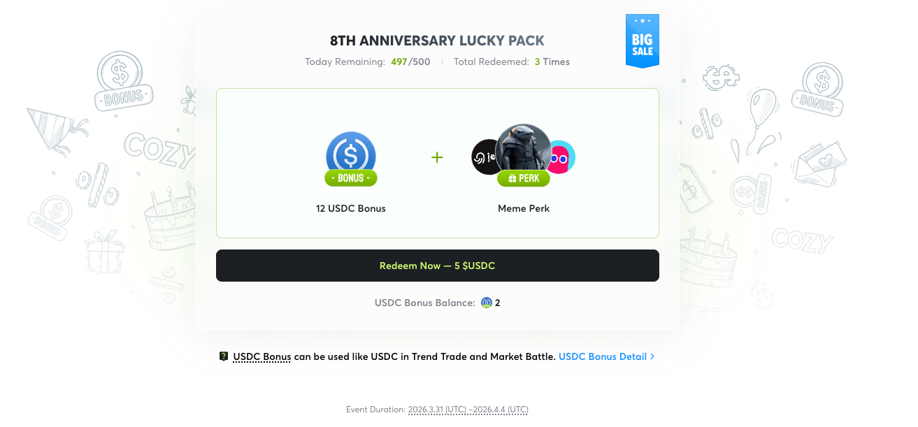 - Terima bonus 12 USDC + Meme Perk secara instan