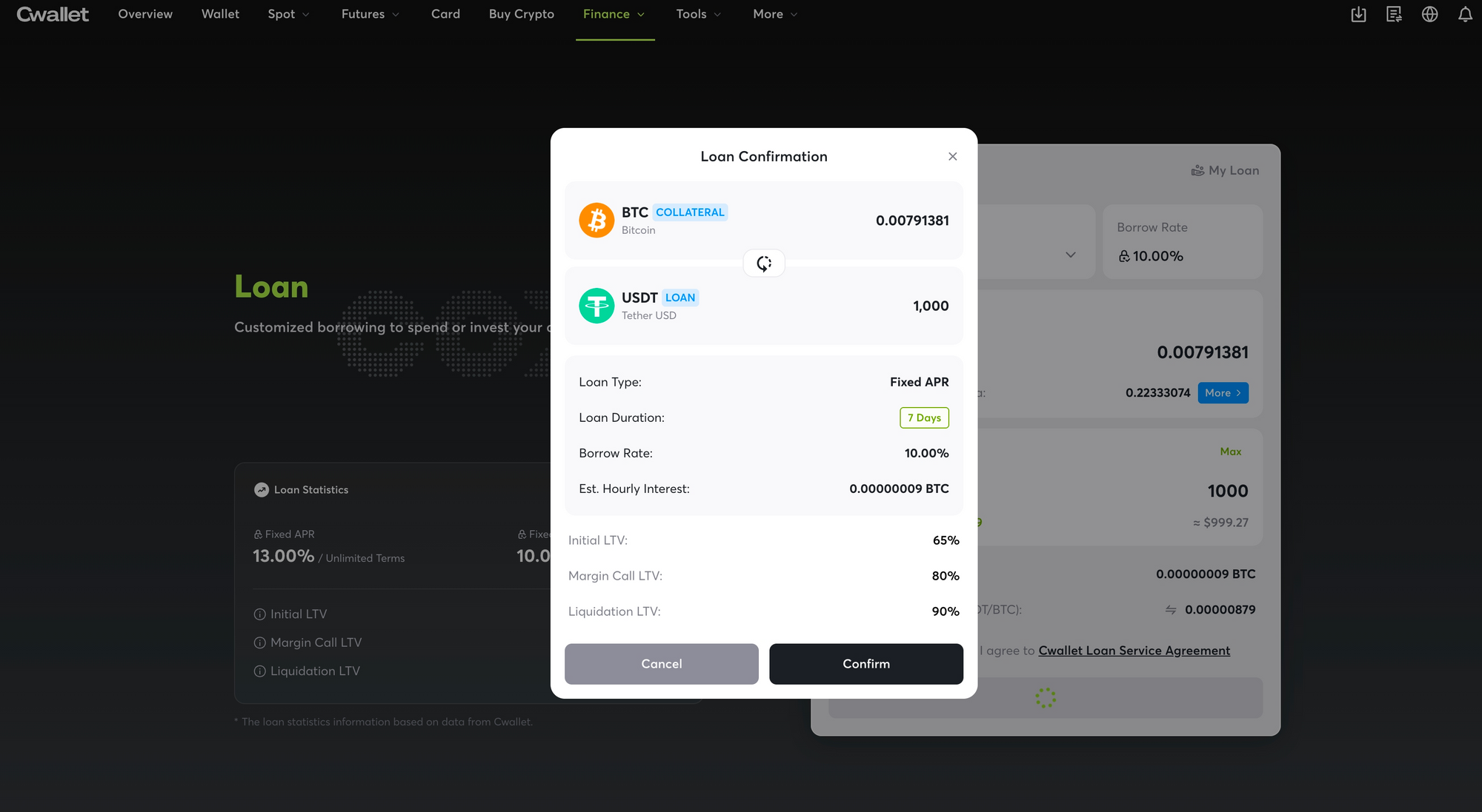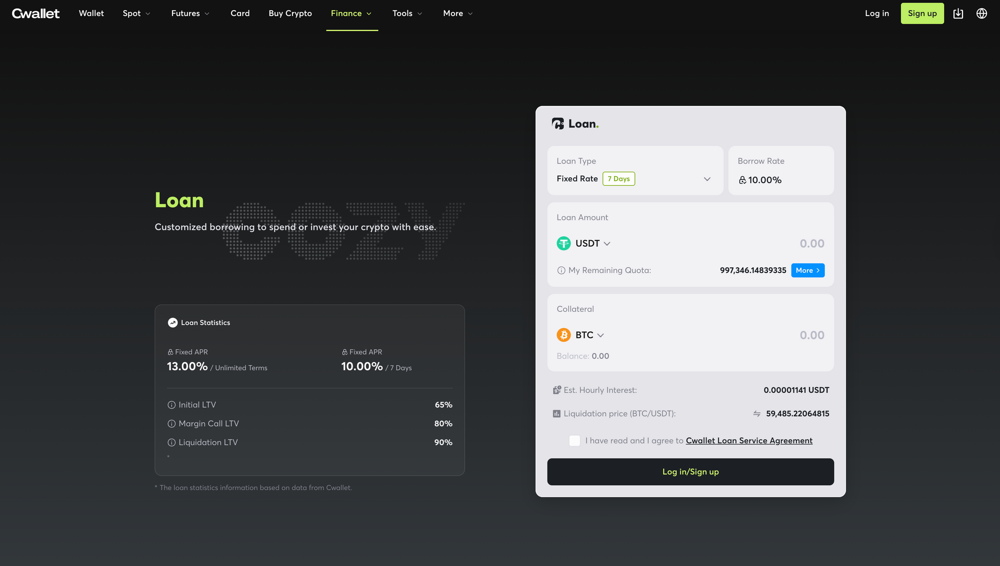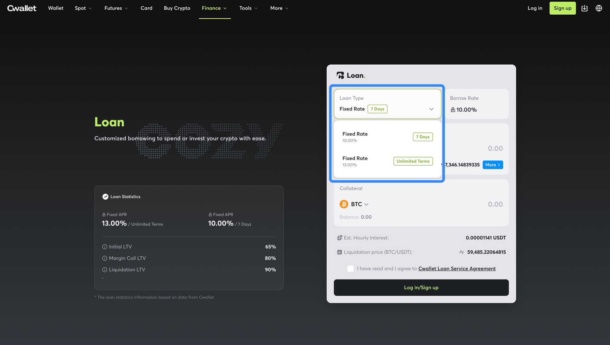 On the Cwallet Loan page, you can select the terms that fit your strategy. Cwallet offers different options, such as a short-term Fixed Rate loan (7 days) or a loan with Unlimited Terms.