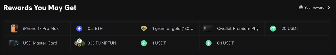This is a reward system built around your activity. Every spin gives you a chance to win real, tangible prizes — from crypto and gold to physical cards and gadgets — reflecting the effort you put into trading and engaging on Cwallet.