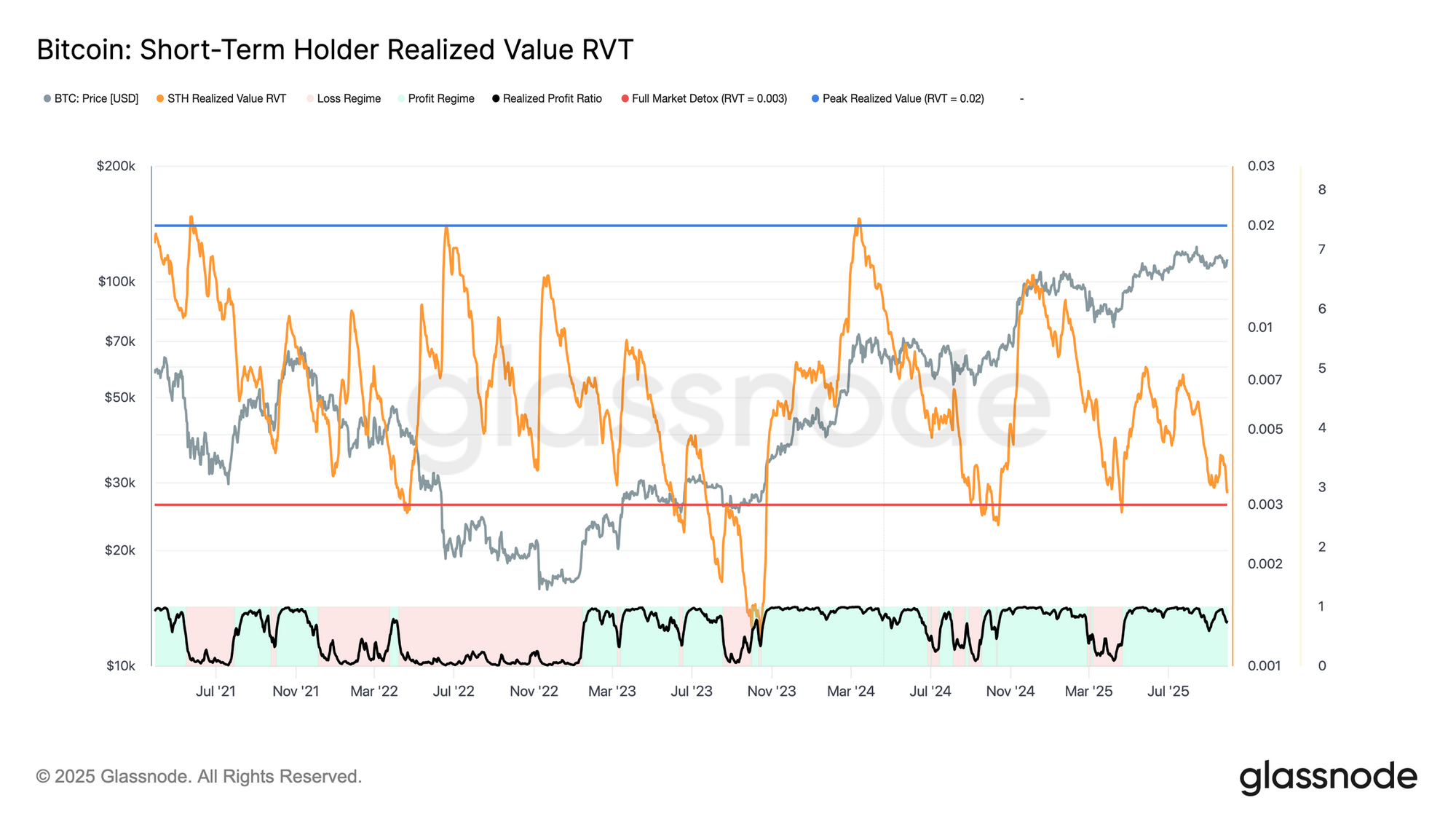 Despite price repeatedly finding support around the short-term holder cost basis, a longer-term trend is emerging beneath the surface. The Short-Term Holder Realized Value (RVT) ratio, which measures the economic value realized relative to the nominal value transferred, has steadily declined since May.