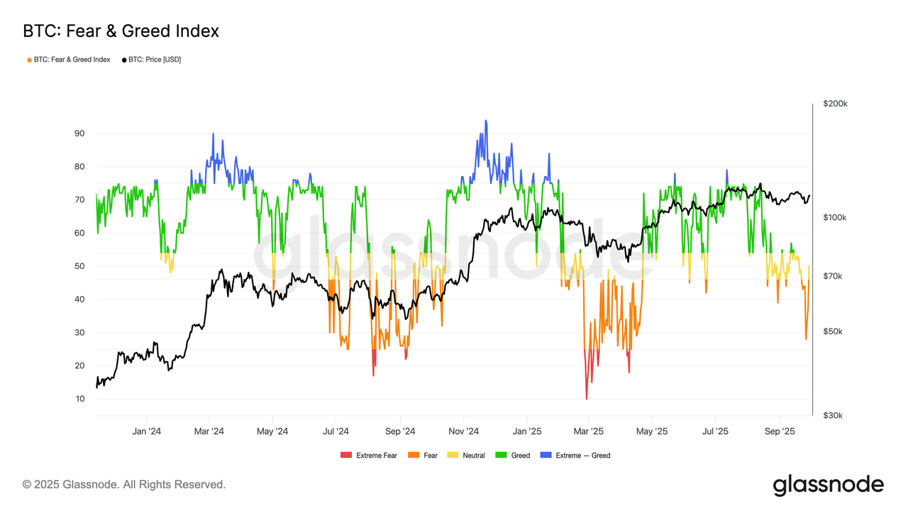 As the broader backdrop of cooling speculative activity unfolds, sentiment has followed suit. The Bitcoin Fear & Greed Index has shifted sharply lower, sliding from sustained Greed earlier this year into Fear and Neutral territory. This shift signals profit-taking, reduced risk appetite, and a more cautious stance among participants.
