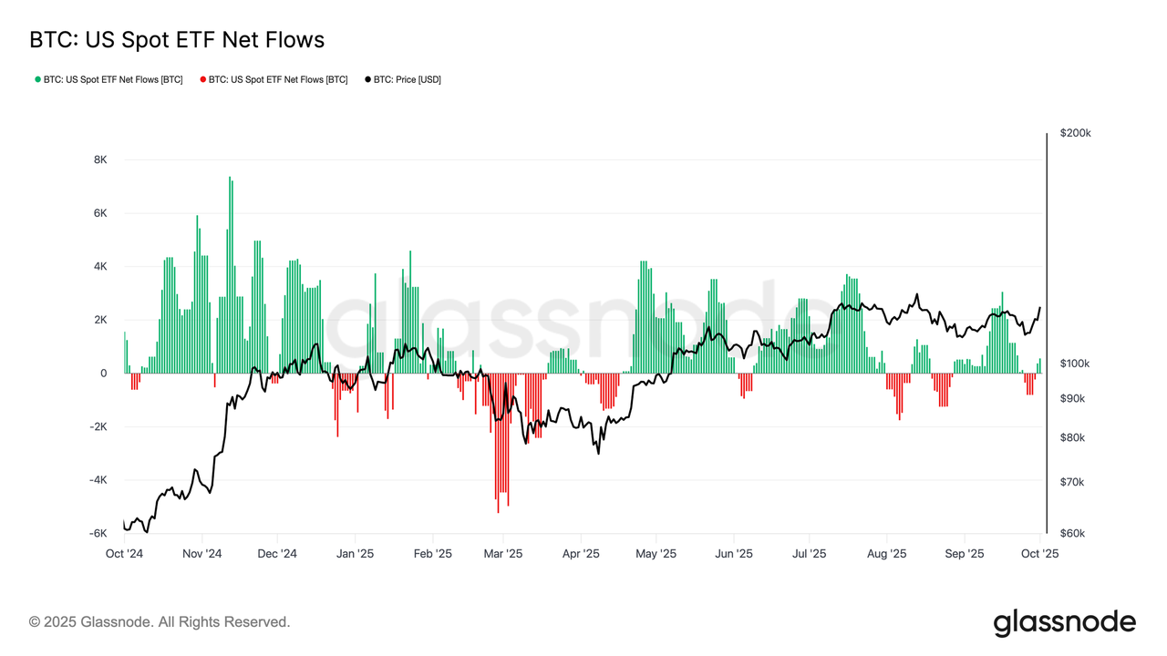 Complementing the slowdown in long-term holder distribution, US Spot Bitcoin ETFs remain a central force in market structure. Flows have been volatile in recent months, with mid-September’s strong inflows followed by a string of outflow sessions.