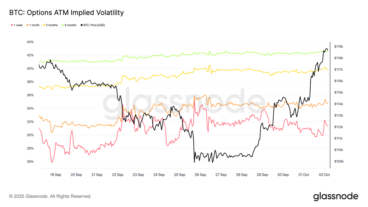 Despite the front-end retreat, implied volatility remains elevated relative to realized, keeping carry trades positive, though less compelling than a week earlier. The term structure remains in contango, with short-dated contracts anchored around 30% IV, while three-month and longer maturities hold between 39% and 43%. The steepening highlights a shift from short-term risk hedging to more measured, longer-dated caution.