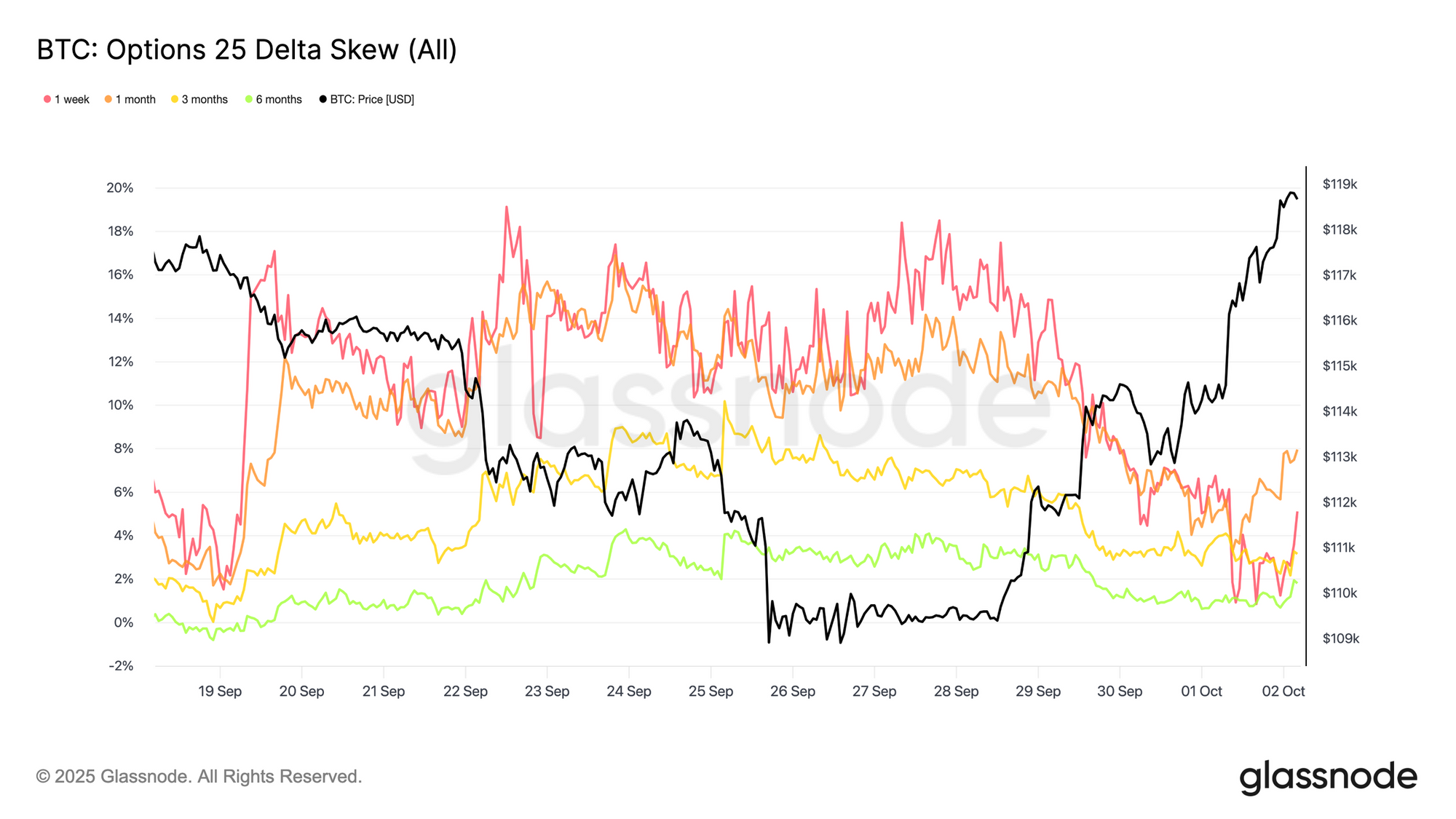 Building on the softer front-end volatility, option skew has also moderated. The 25-Delta Risk Reversal in one-week contracts fell sharply from roughly 18.5 vol points to around 6 vol points, marking a significant move away from downside protection toward balance. Longer maturities have also flattened, drifting closer to neutral territory. This adjustment reflects cooling demand for puts as immediate downside stress eases, while call premiums begin to catch up. Together, the shift signals a more balanced risk outlook, where traders are less focused on hedging tail risk and more willing to express directional upside.
