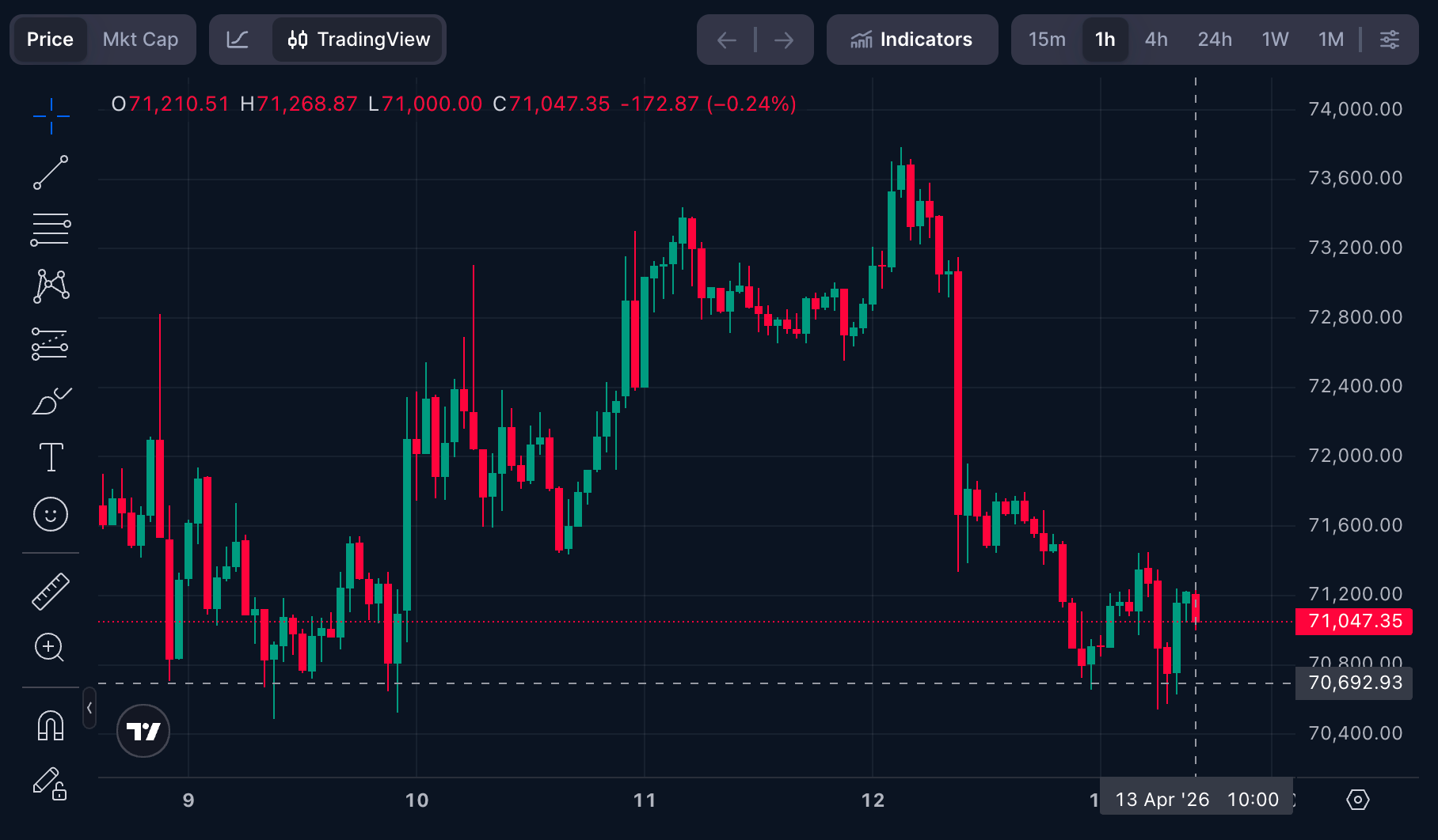 As of April 13th, Bitcoin is trading around $$71,054, holding above recent support levels but failing to generate sustained upside momentum. This divergence — stability without strength — continues to define the current market environment.