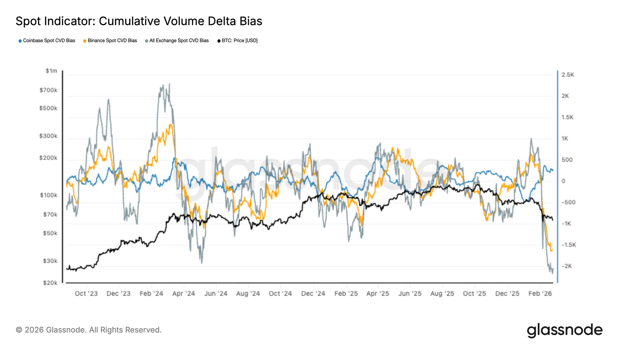 Spot markets have shifted decisively toward selling dominance, with Cumulative Volume Delta (CVD) indices at cycle lows — especially on major venues — reflecting active distribution. This suggests that the recent downside moves are not purely driven by passive liquidity gaps but by deliberate sell-side pressure, outweighing bid absorption.