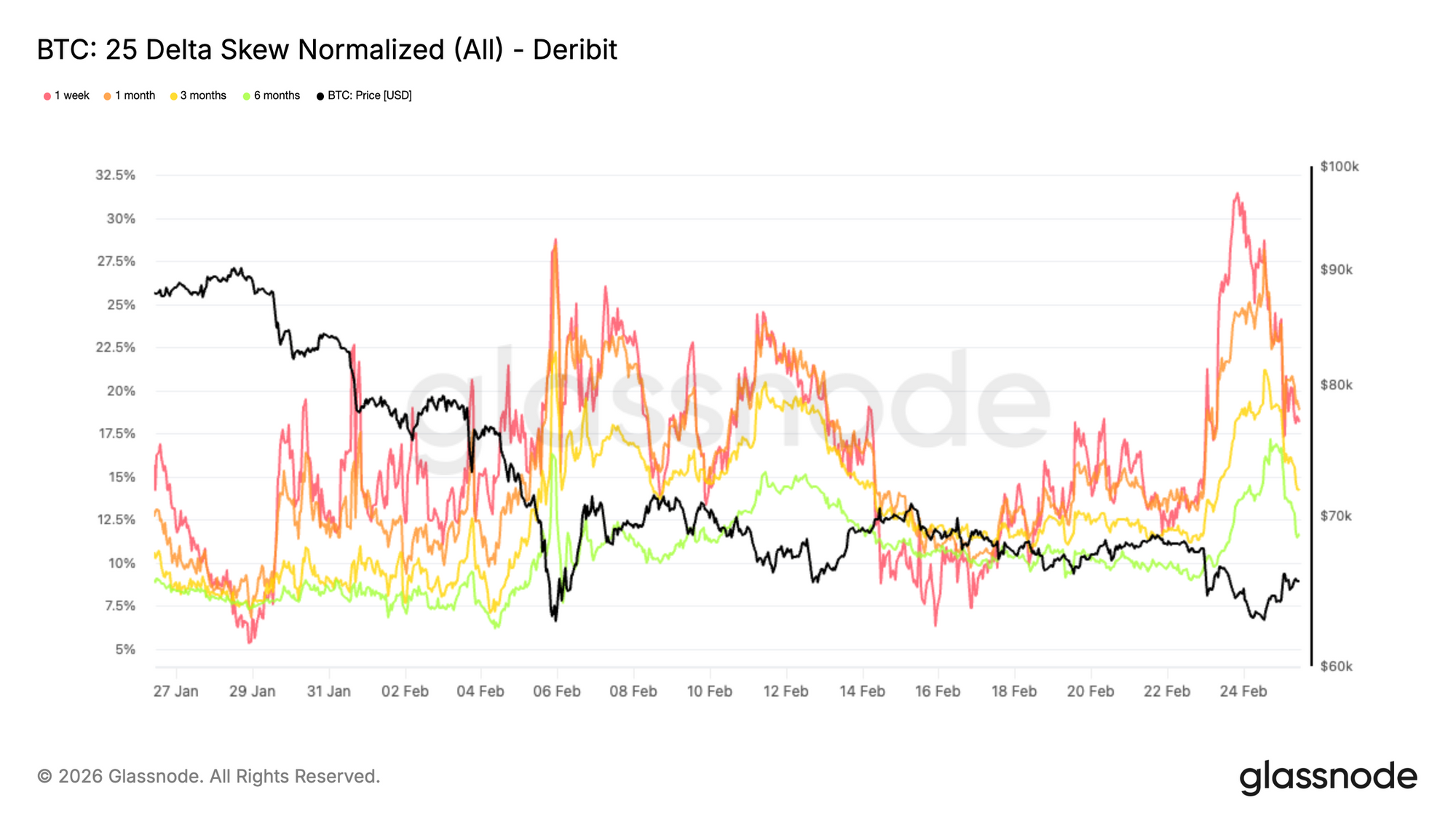 - 25-delta skew tetap tinggi untuk perlindungan terhadap penurunan harga, menunjukkan bahwa para pelaku pasar bersedia membayar premi untuk hedging terhadap penurunan harga bahkan ketika kepanikan mereda.