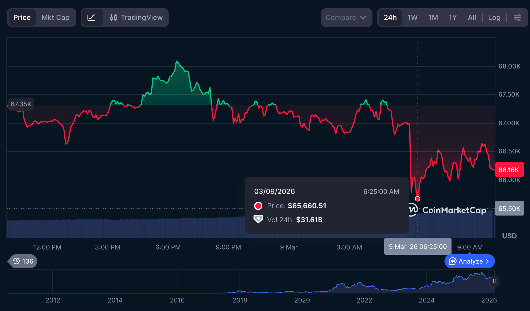 Pada tanggal 9 Maret, Bitcoin sempat turun di bawah $6.600, tetap berada dalam kisaran konsolidasi $60.000–$70.000 yang lebih luas yang telah mendefinisikan struktur pasar baru-baru ini.