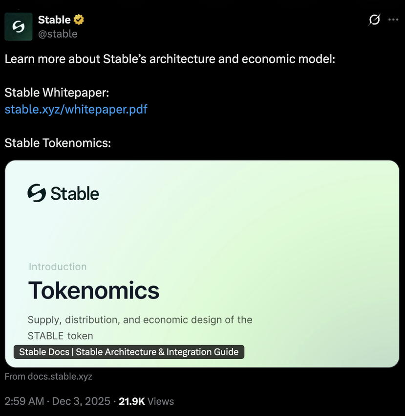 - The tokenomics prioritize governance, ecosystem growth, and long-term stability, separating STABLE token from gas fees paid in USDT.