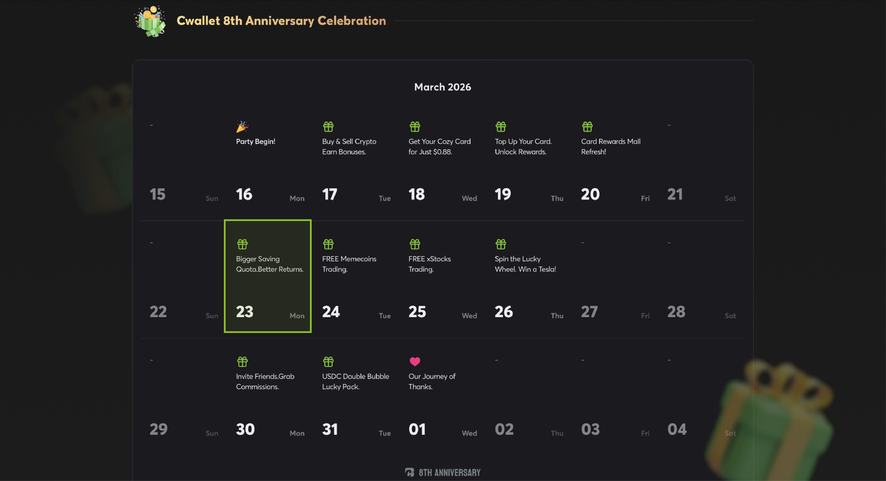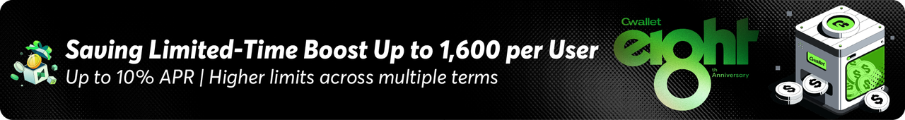 From 📅 March 23 to March 31 📅, every Cwallet user receives an automatic 1,600 USDT boost to their Simple Earn saving quota as part of Cwallet's 8th Anniversary celebration. No tasks to complete, no forms to fill, no hoops to jump through. You log in, and the extra room is already there.