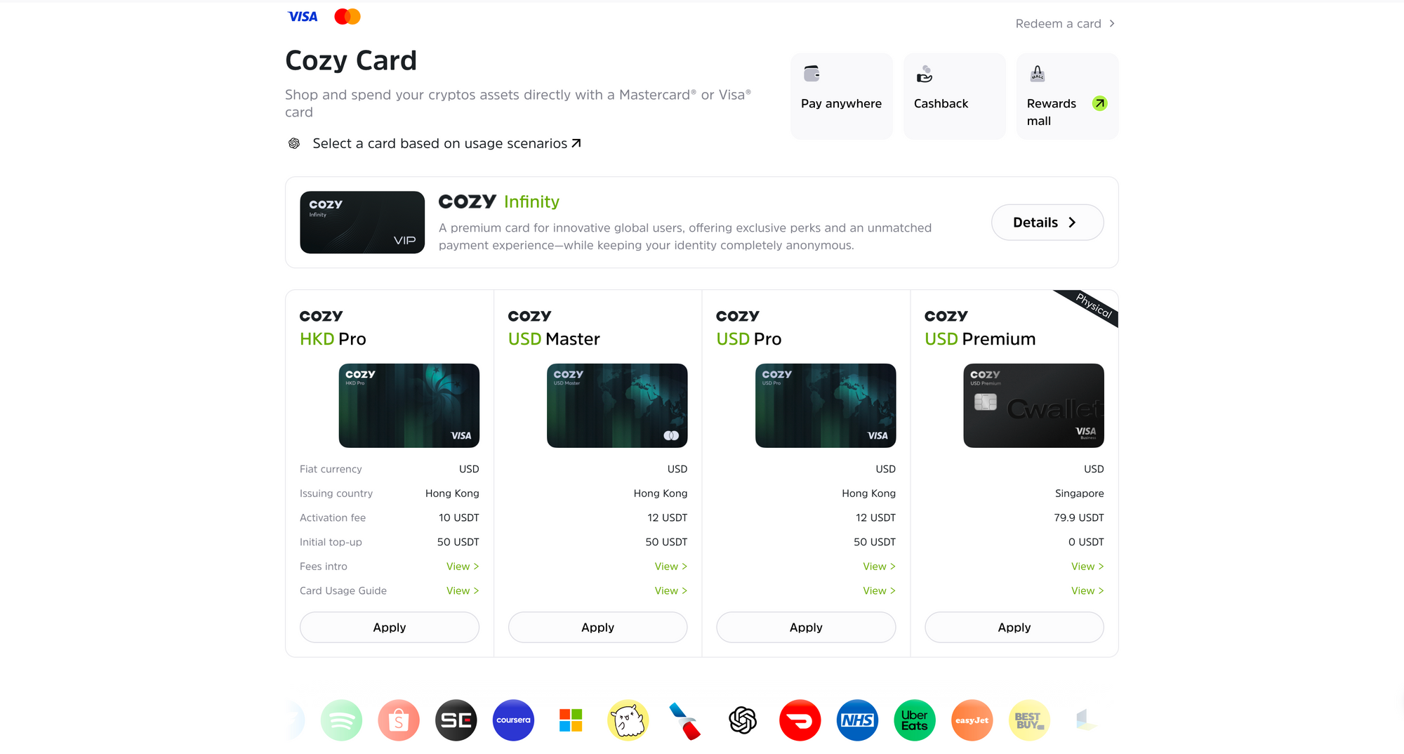 - Cozy USD Premium — physical Visa card, issued in Singapore, activation fee 79.9 USDTJust mind that, all cards require a minimum initial top-up of 50 USDT to start using.