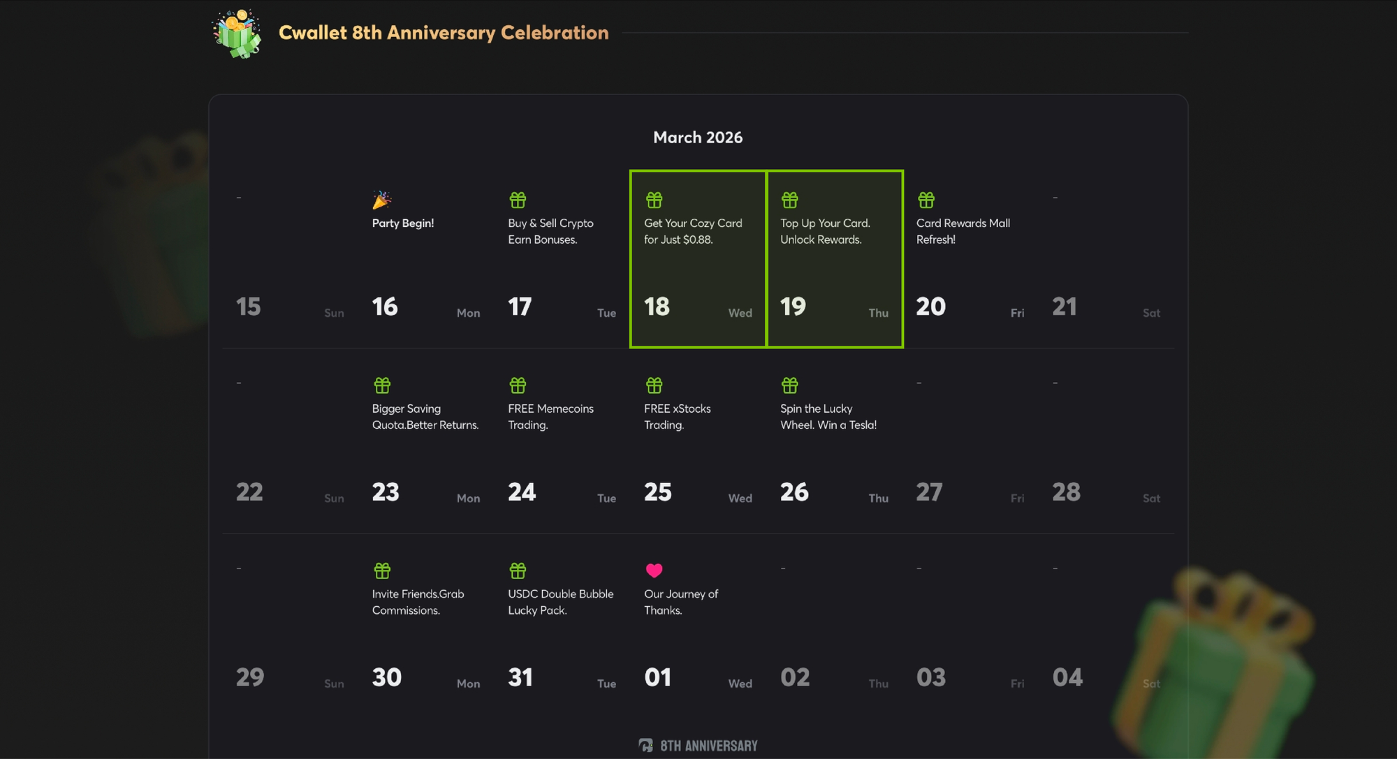 If you've been on the fence about opening a Cozy Card, here's your nudge. Cwallet is celebrating its 8th anniversary this March — and for the occasion, we're dropping two back-to-back activities that make getting started cheaper and more rewarding than ever.