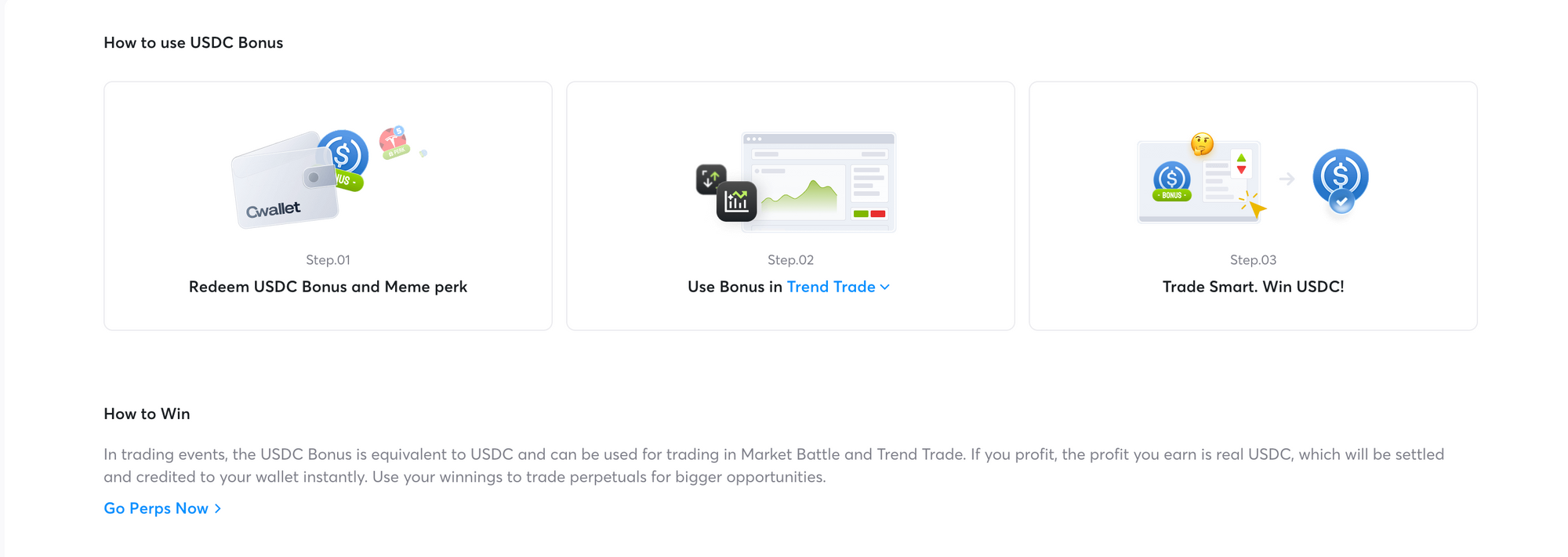 The USDC Bonus can be used directly in Trend Trade and Market Battle, where traders put strategies into action under real market conditions.