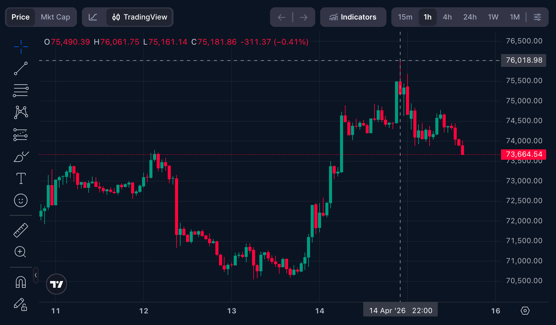 Pada akhir 14 April, Bitcoin naik lebih dari 5% hingga mencapai puncaknya di dekat $76.120, merebut kembali level harga yang tidak terlihat selama lebih dari dua bulan. Pergerakan ini sepenuhnya menghapus penurunan akhir pekan yang sempat menekan harga turun menuju $70.600.