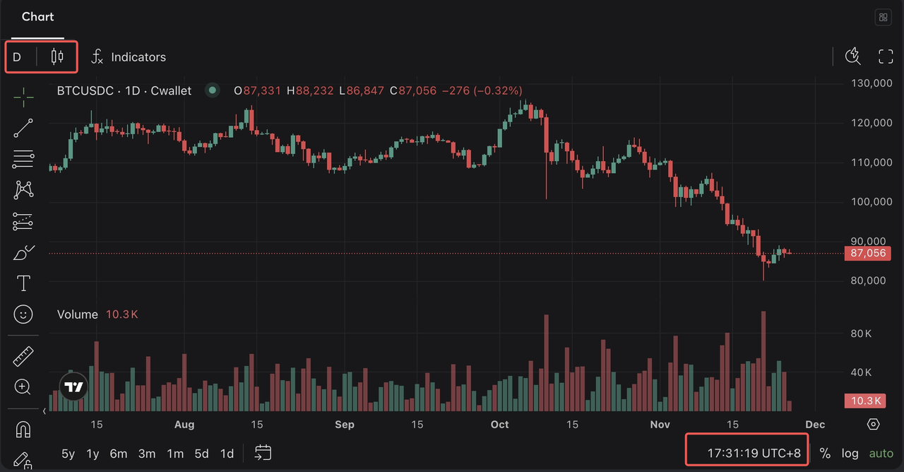 Antarmuka grafik Cwallet didukung oleh TradingView, memberi Anda akses ke alat-alat kelas profesional tanpa meninggalkan platform. Beberapa indikator yang paling umum digunakan meliputi: