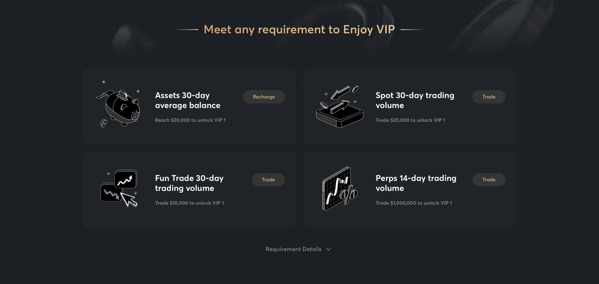 Untuk mencerminkan hal tersebut, kami telah merancang sistem masuk empat dimensi. Anda tidak perlu mengubah cara Anda berinteraksi dengan kripto untuk menjadi VIP; Anda hanya perlu terus melakukan apa yang Anda kuasai. Berikut adalah cara untuk membuka status Anda: